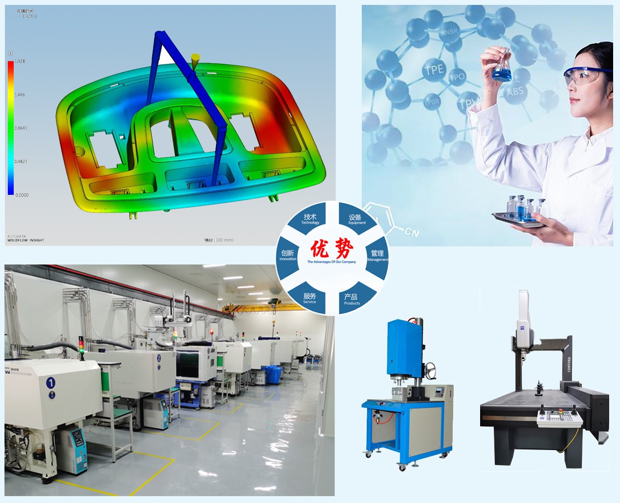 ???????公司具備高分子材料改性與選型、模具設計與制造、高分子構件成型(通用注塑、結構發泡注塑、氣輔注塑、PPSU高溫注塑、無磁注塑)以及表面后處理、大型組件裝配等一站式解決方案的能力,擁有注塑量1克-15000克、鎖模力60噸-4500噸的注塑成型機30余臺,進口氣體輔助設備和三坐標、長度、熱工、壓力、理化等測試設備,具備承攬各類工程塑料加工能力。 ???????公司現正建設環上大科創園產學研基地,并與部分高校、科研院所合作設立了聯合研發基地,在高分子構件新技術應用領域開展持續的探索和研究。